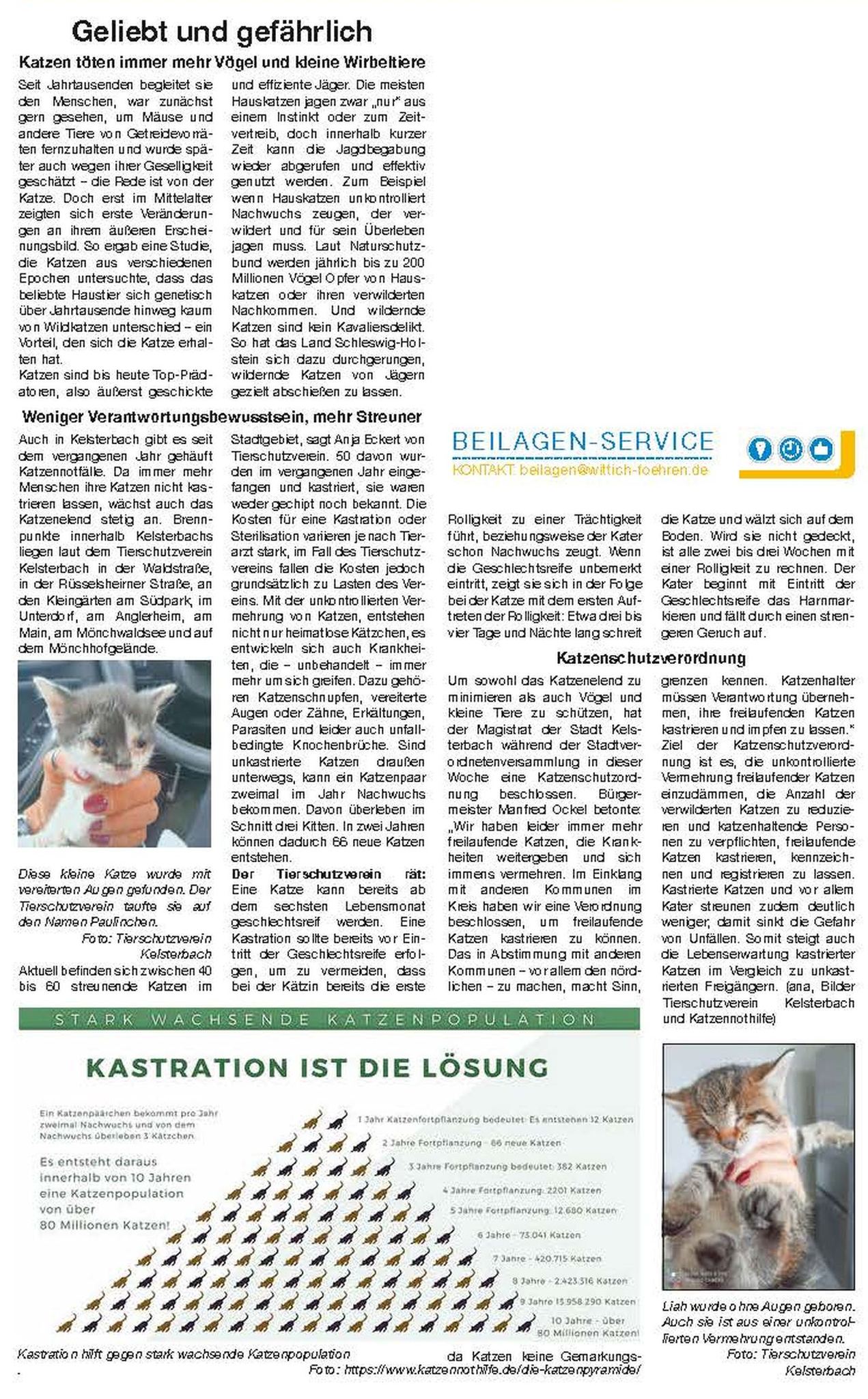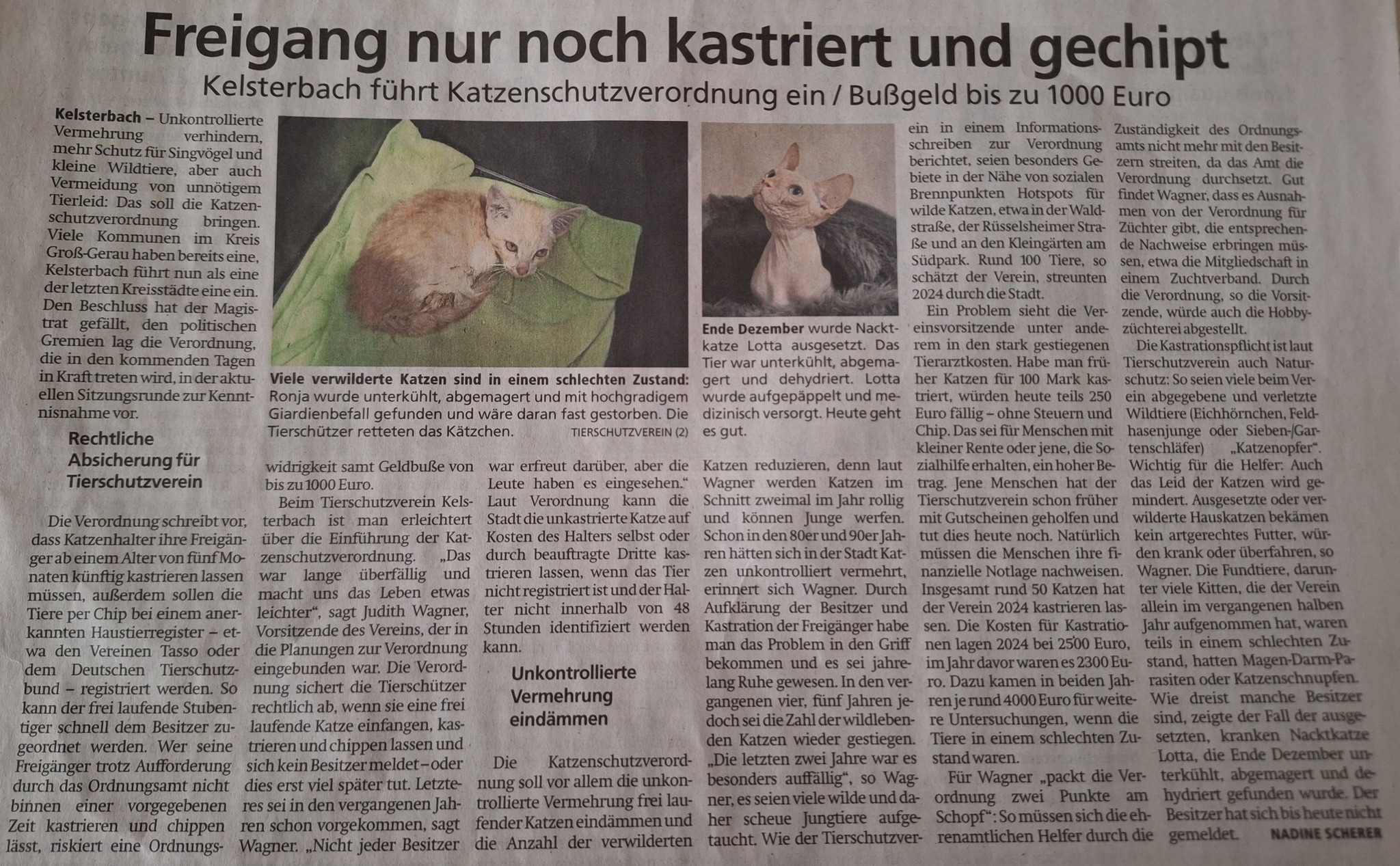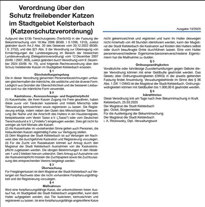 Die Kelsterbacher Katzenschutzverordnung wurde am 28.03.25 im Kelsterbach Aktuell veröffentlicht und ist deshalb am Samstag, 29.03.25, in Kraft getreten !!!