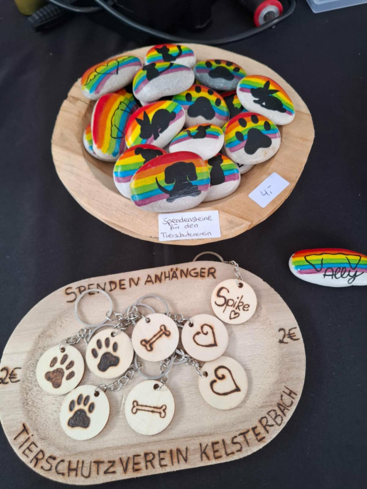 Der Tierschutzverein Kelsterbach bedankt sich im Namen seiner Schützlinge bei Kati Rolle, die am Altstadtfest 2025 wieder eine tolle Aktion gestartet hat. Schlüsselanhänger aus Holz mit tollen Motiven und Gedenksteine für tierische Familienmitglieder, die bereits über die Regenbogenbrücke gehen mussten, wurden zugunsten des Tierschutzvereines verkauft und erbrachten stolze 55,- Euro.