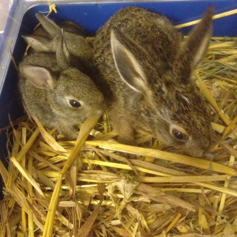 links sitzen zwei Kaninchenbabys und rechts ein Feldhasenbaby